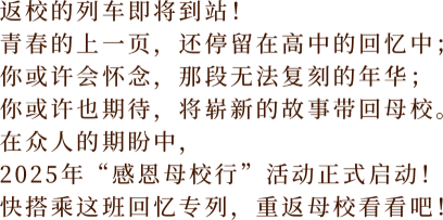 “感恩母校行”是由香港中文大学(深圳)学生大使团组织筹办的年度大型活动。本活动旨在鼓励学生利用圣诞假期及春节假期的时间,回访高中母校,向师长表达感恩,与学弟学妹们分享大学生活。
